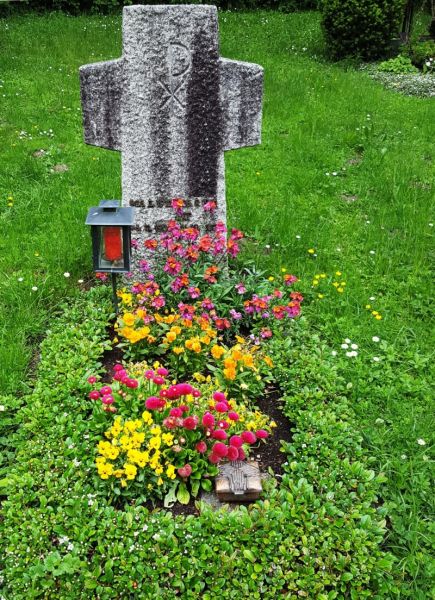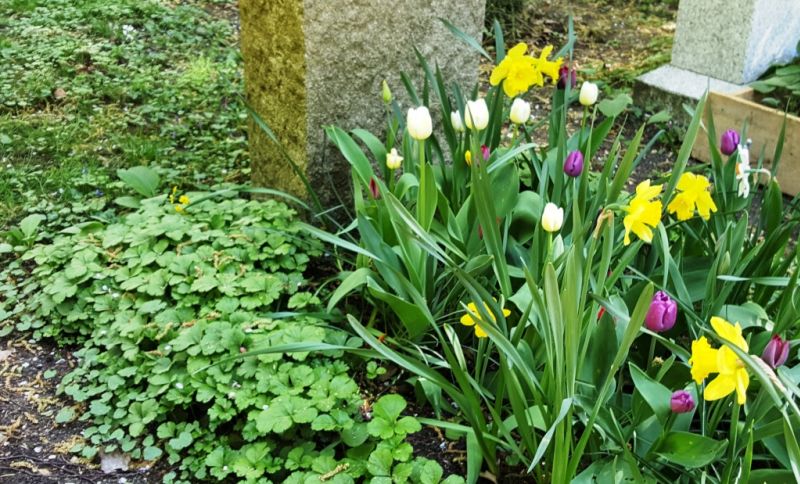 Zum Hingucker in der Wechselbepflanzung werden Zwiebelblüher, wie Krokusse, Narzissen und Tulpen, die vorgetrieben aus einer Friedhofsgärtnerei in der Nähe, jetzt in Kombination mit einem bunten Primel-Mix das Grab zu Leuchten bringen. Außerdem eignen sich Gänseblümchen (Bellis), die in den Farben Weiß, Rosa und Rot angeboten werden, Stiefmütterchen (Viola) in allen Farben und Farbkombinationen, sowie weiße, rosa- und blaublühende Vergissmeinnicht (Myosotis) als dankbare Kombinationspartner.