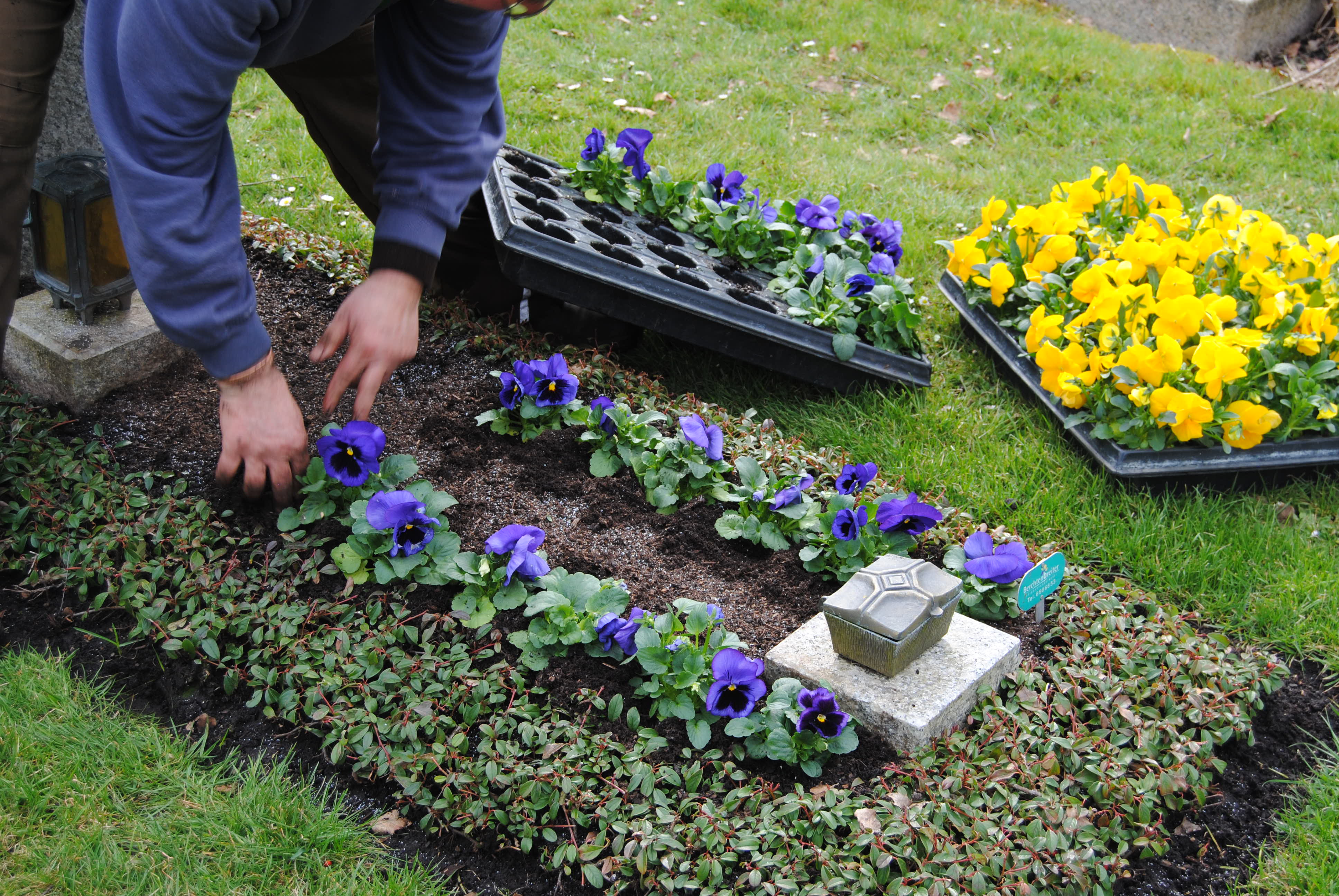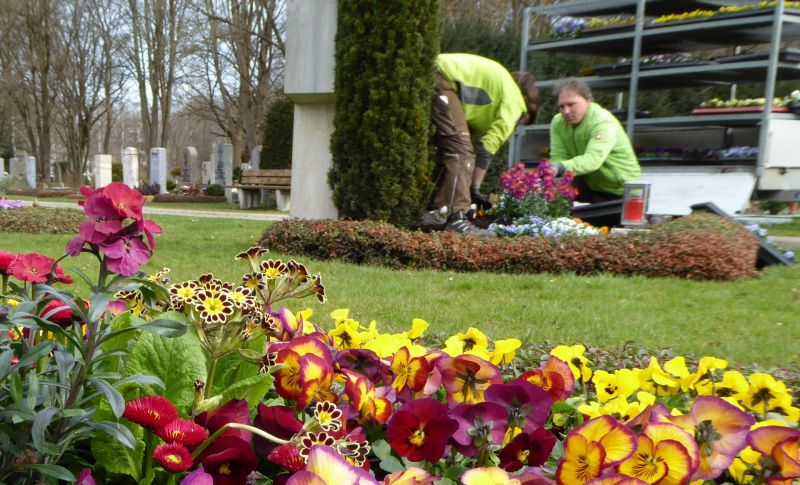 Bild 1: Zu jedem Saisonbeginn, ob Frühling, Sommer oder Herbst sind auch die Friedhofsgärtner an den Grabstätten ihrer Kunden, um verblühte Pflanzen zu entfernen und neue Blumen zu pflanzen. [Download]